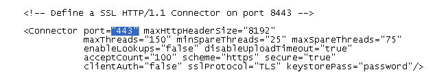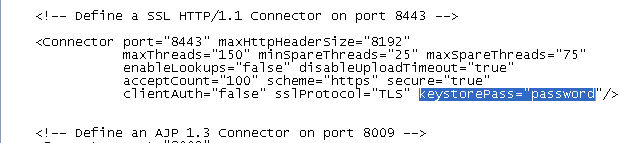 <!-- Define a SSL HTTP/1.1 Connector on port 8443 --> (By removing <!-- and --> tags below the line) - Add new attribute keystorePass=”password” to the Connector element. If you haven’t change keystore’s password, you don’t have to add this attribute.